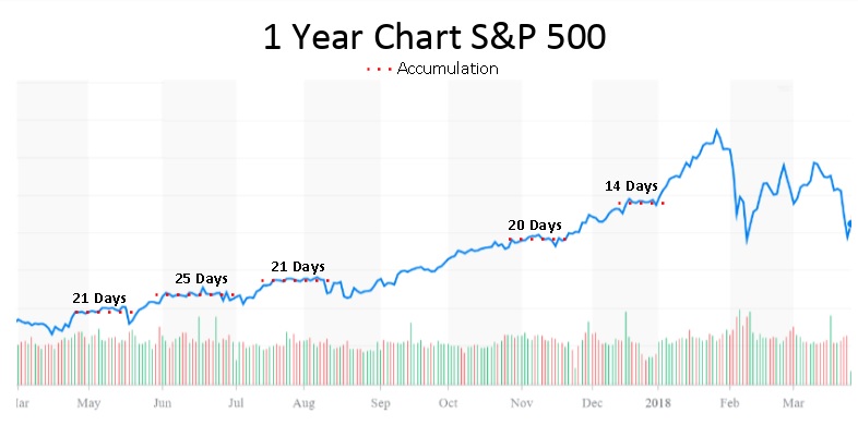 Up until the entire first quarter of 2018, the S&P 500 had experienced five accumulation or consolidation (sideways pattern) periods ranging from 14 to 25 days. This happening indicated a very healthy Bull market. However, that all changed. During the first quarter of 2018, the S&P 500 will not experience even one period of accumulation or consolidation.