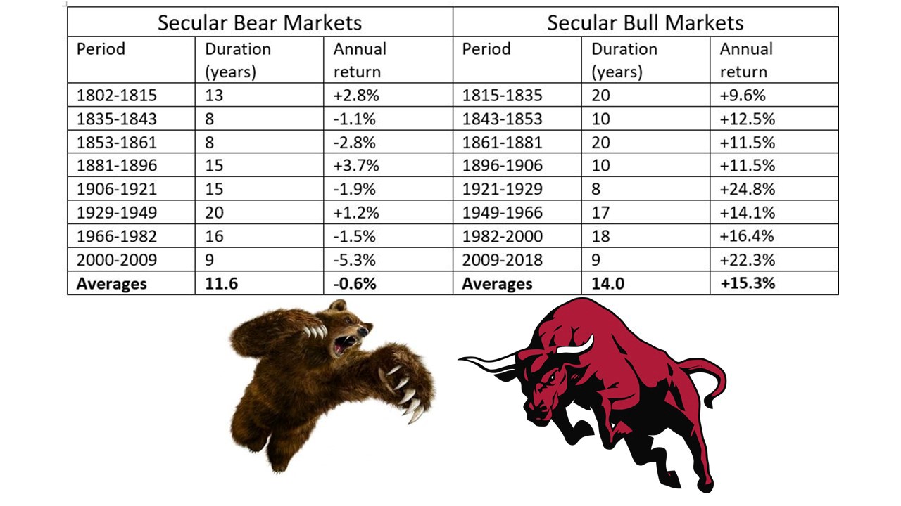 The seventh follows Facebook’s nail. See “Sixth Nail in Deceased bull’s coffin is Facebook”. Each additional nail increases the probability that the market will not get back to its January 2018 all-time high for at least eight years. This is because it’s likely the new secular bear market was born in January 2018. The table below which includes the eight secular bulls and bears since 1802 depicts that the recently departed bull had run its course based on its age and performance.
