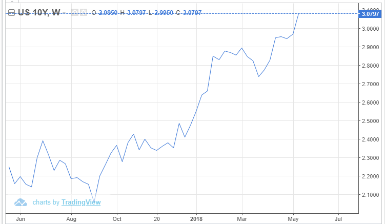The one-year chart below for US 10 Year US Treasury note depicts that its yield has risen sharply from just above 2% in September of 2017.