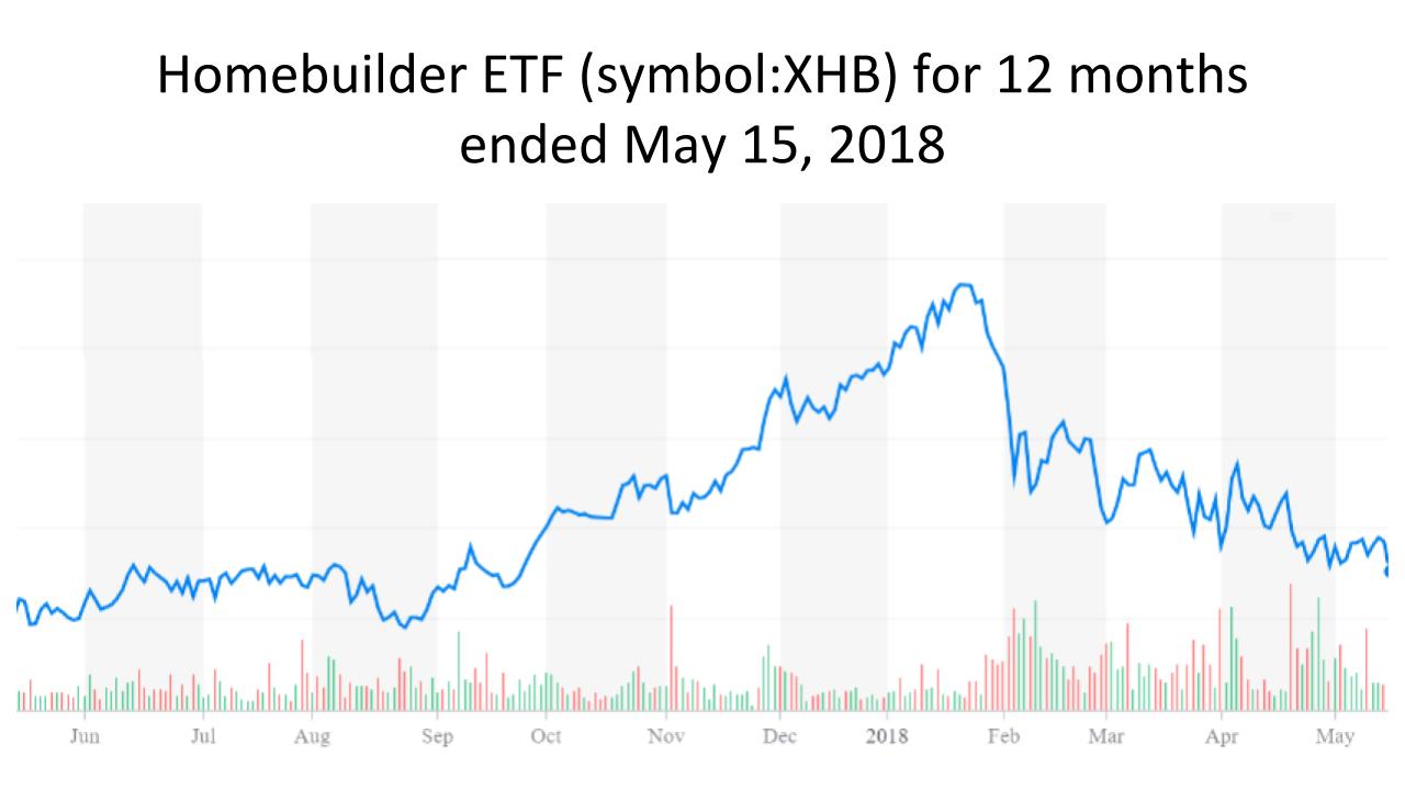 The markets are very especially sensitive to the 10 Year US Treasury note.  It’s because its yield is the bench mark that is used to set mortgage rates.  Therefore, mortgage rates are also on their way up. Its why the XHB, which is the symbol for the Homebuilder ETF fell by more than 2% today.  The chart below depicts that the ETF has been in a steady decline since February 2018. It was when the Federal Reserve announced that the discount rate would be raised four times throughout 2018.