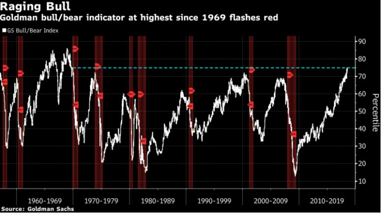 An indicator that was developed by Goldman Sachs which measures future bear-market risk has risen to its highest level in 50 years.   Goldman’s Bull/Bear Index, which is based on the metrics below is at its highest level since 1969.