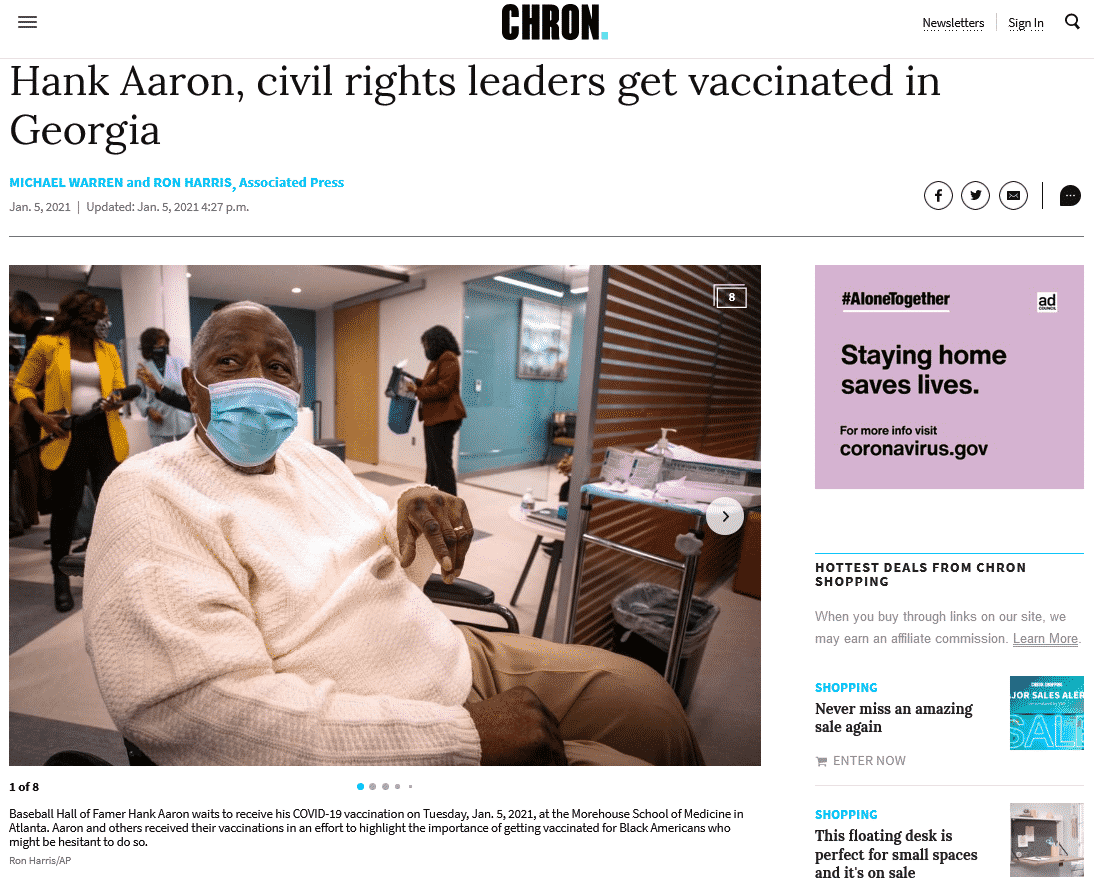 Aaron’s vaccination was widely publicized. See AP “Hank Aaron, civil rights leaders get vaccinated in Georgia”, January 5, 2021. I had initially learned about Aaron’s noble deed from a local radio station’s disk jockey.