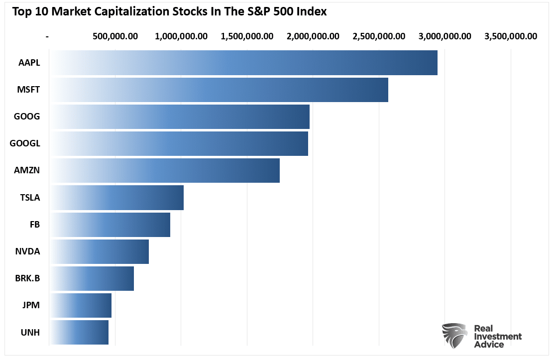 In “Passive ETFs Are Hiding A Bear Market,” I discussed the illusion of performance in the major indices. That illusion gets created by the largest market capitalization-weighted stocks. As a company’s stock price appreciates, it becomes a more significant index constituent. Such means that prices changes in the largest stocks have an outsized influence on the index.