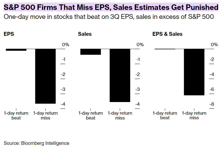 All told, companies in the S&P 500 that have beat projections on earnings per share and sales have underperformed the benchmark by an average of 0.1% within a day of reporting, well below the norm of the past six years, data compiled by Bloomberg Intelligence show. Meanwhile, those that fell short trailed by 6.2%, the biggest negative reaction in a year.