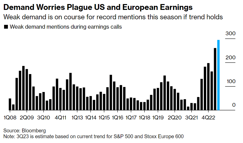 At just over the half-way mark of the reporting period, “weak demand” is among the top trending phrases on earnings calls, according to a Bloomberg analysis of transcripts for the S&P 500 and the Stoxx Europe 600 benchmarks. If the pace of mentions holds for the next few weeks, it would be the most on record, according to data compiled by Bloomberg going back to 2000.