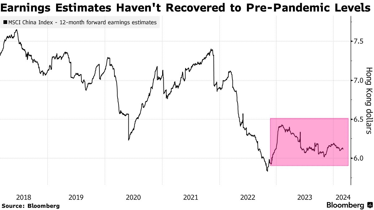 Earnings for the MSCI China Index are estimated to have grown a mere 1.6% in 2023, with the five-year average showing a 3.3% decline. In the previous decade, the average annual gain was 6%.