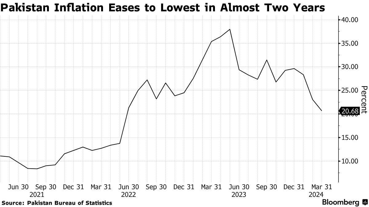 Consumer prices rose 20.68% from a year ago, according to data released by the Pakistan Bureau of Statistics on Monday. That compares with a median estimate for a 20.4% gain in a Bloomberg survey and 23.06% in February.
